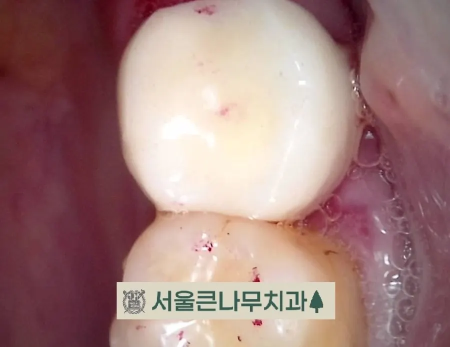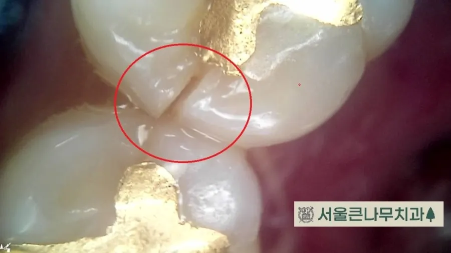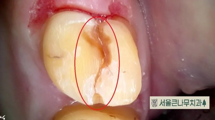 오래된 수복물 주변으로 거무스름한 착색과 크랙이 이어져있습니다. 이렇게 일직선으로 이어진 크랙은 뿌리까지 쪼개져 있을 가능성이 높아 더더욱 위험합니다.