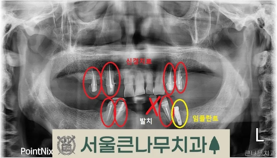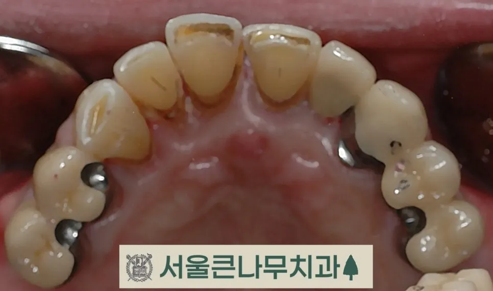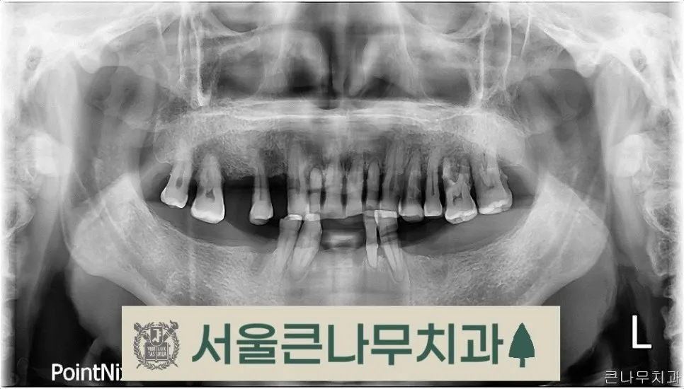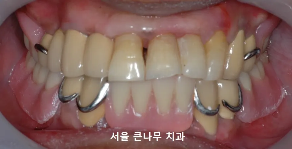 잇몸뼈가 거의 녹아 살릴수 없는 치아도 많았고 발치 후 살릴수 있는 치아만 신경치료하여 쓰게 되었습니다.