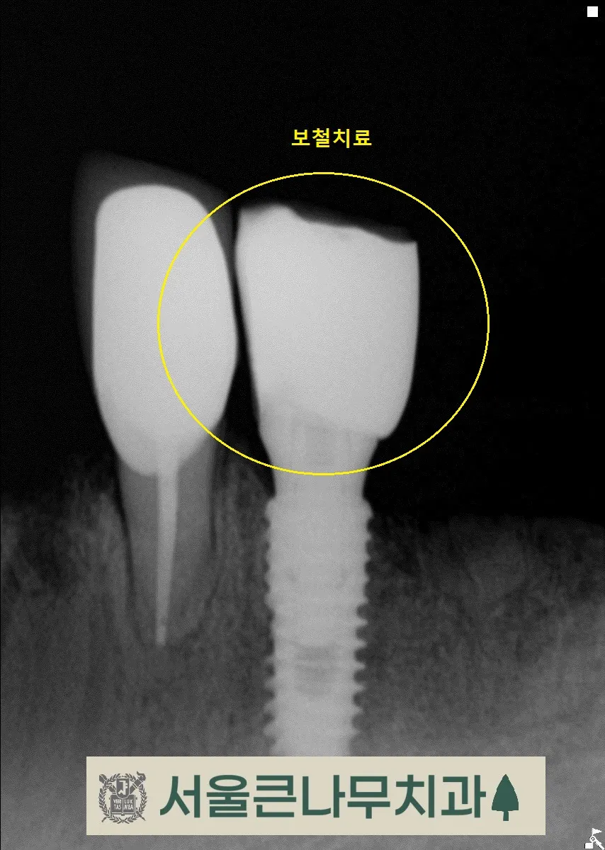 발치로 인해 상실된 공간을 임플란트를 하나 심어 채워주었습니다.