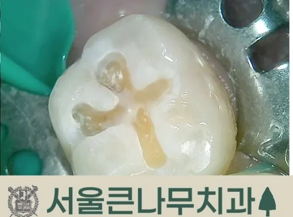 조금 더 제거해 보니 옆 치아의 충치 또한 잘 보였습니다.