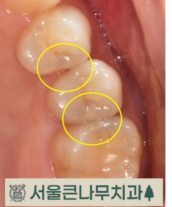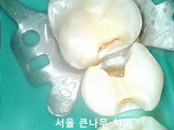 탁한 부분 중에도 치아가 서로 맞닿는 부분(인접면)이 특히 까만 모습입니다. 육안으로 보일 정도의 차이는 이미 충치가 많이 진행되어 있는 상태이기 때문에 치료가 당일에 완료되지 않을 수도 있습니다.