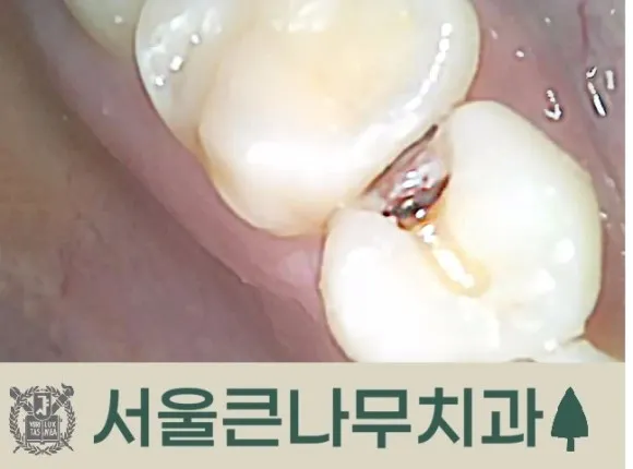 충치가 깊어 신경과 많이 가까운 상태였고, 치아를 보호해 주기 위해 보호 약재(MTA)와 레진으로 보강해 준 상태입니다.