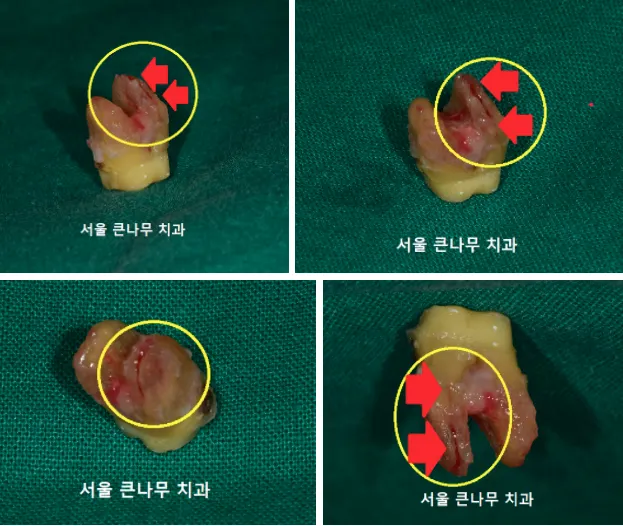 발치한 치아의 사진입니다. 보시면, 치아 뿌리 파절을 확실하게 확인할 수 있습니다.