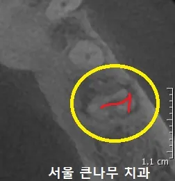 치아의 뿌리 부분이 점점 진해지는 것으로 보였는데요. 치아 뿌리 끝 갈라짐이 의심되었습니다.
