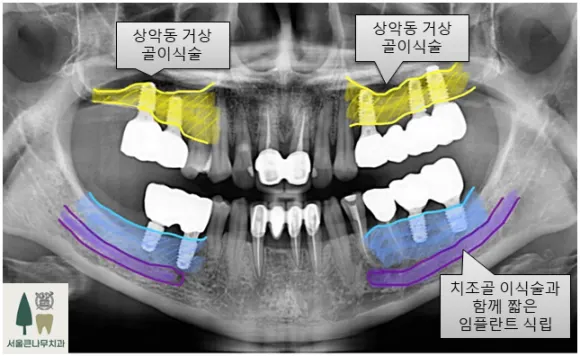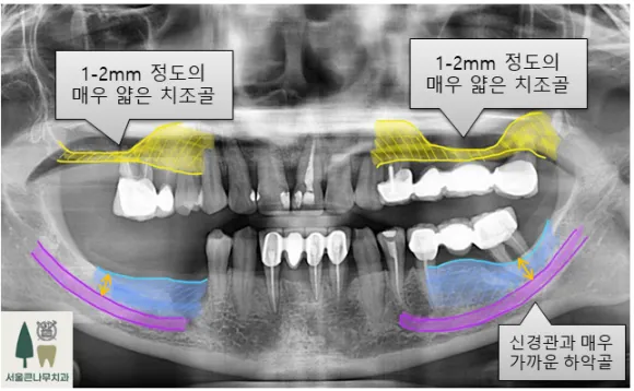 아래 치아의 경우 임플란트를 식립하면서 치조골 이식술을 같이 병행하게 됩니다. 아래턱은 잇몸뼈가 약해지면 신경과의 거리가 가까워지는 경우가 많기 때문에 치아 발치 후 오래동안 방치되는 경우 임플란트 식립이 매우 힘들어지거나 신경 손상 우려가 있습니다.